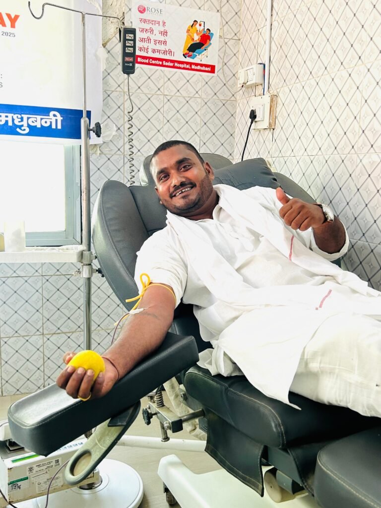 उन्होंने मधुबनी सदर अस्पताल इस्तिथ ब्लड बैंक में जाकर एक जरूरतमंद मरीज के लिए उनके परिजनों एवं अन्य कई लोगों की मौजूदगी में अपने जीवन का कीमती 31वाँ रक्तदान किया।