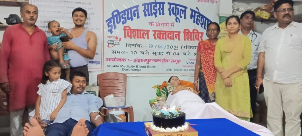मधुबनी जिले के महेशपुरा में रविवार को झंझारपुर रक्त सेवा समूह के तत्वावधान में इंडियन साइंस स्कूल के प्रांगण में प्राचार्य, झंझारपुर सेवा समूह एवं दधीचि देहदान समिति झंझारपुर मधुबनी के अध्यक्ष प्रदीप कुमार अपने शादी की 9वीं वर्षगांठ के शुभ अवसर पर समस्त रक्तदाताओं एवं परिवार के सहयोग से एक रक्तदान शिविर का आयोजन किया। यह रक्तदान शिविर शुक्ला मेडिसिन ब्लड बैंक, दरभंगा के सहयोग से आयोजित किया गया था।