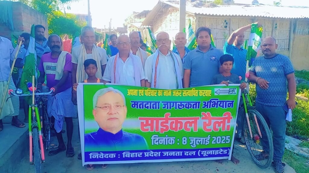 बताते चलें कि सैकड़ों की संख्या में जदयू नेताओं और कार्यकर्ता व युवाओं और बच्चों के साथ साइकिल रैली के माध्यम से मतदाताओं को मतदान करने के लिए जागरूक किया। रैली के दौरान “संकल्प हमारा टूटे न,एक भी मतदाता छूटे न। जन-जन की यही पुकार-वोट देना हमारा अधिकार”। नारा लगाते हुए मतदाताओं को जागरूक किया गया।