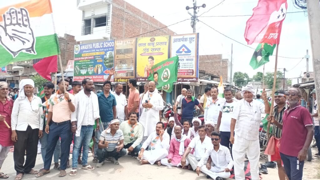 मौके पर राजनगर विधानसभा कांग्रेस के पूर्व प्रत्याशी राम इक़बाल पासवान ने कहा लोकसभा चुनाव के दौरान इसी मतदाता सूची से चुनाव कराए गए वो चुनाव मान्य है। अब बिहार में चुनाव होना है, तब जनता से वोट का अधिकार छीनना चाहती है। वोट का राज मतलब छोट का राज, जो हमें संविधान ने अपना माताधिकार करने का अधिकार दिया है। केंद्र एनडीए की मोदी सरकार मनमानी करके चुनाव आयोग पर दबाव बनाकर सभी से मतदाता पूर्णनिरीक्षण के नाम पर मत का अधिकार से वंचित करना चाहती है। श्री पासवान ने कहा भाजपा और उसके सहयोगियों को पता चल गया है। बिहार में इस बार महागठबंधन की तेज रफ्तार तेजस्वी सरकार बनने जा रही है, इससे मन घबराहट होने लगा है। एनडीए और नरेंद्र मोदी को पता नहीं है कि बिहार उड़ती चिड़िया को हल्दी लगाती है। मोदी जी लाख कोशिश कर ले, इस बार बिहार एनडीए का नितीश कुमार मुख्यमंत्री नहीं बनने जा रही है। 2025 में बिहार बदलाव चाहती है, वर्तमान सरकार से तंग आ चुकी है। मंहगाई, भष्टाचार, घूसखोरी थाना ब्लॉक से लेकर हर जगह बगैर रिश्वत काम नहीं होते गरीब,मजदूर,शोषित-वँचित की अवाज को कुचला जा रहा है।