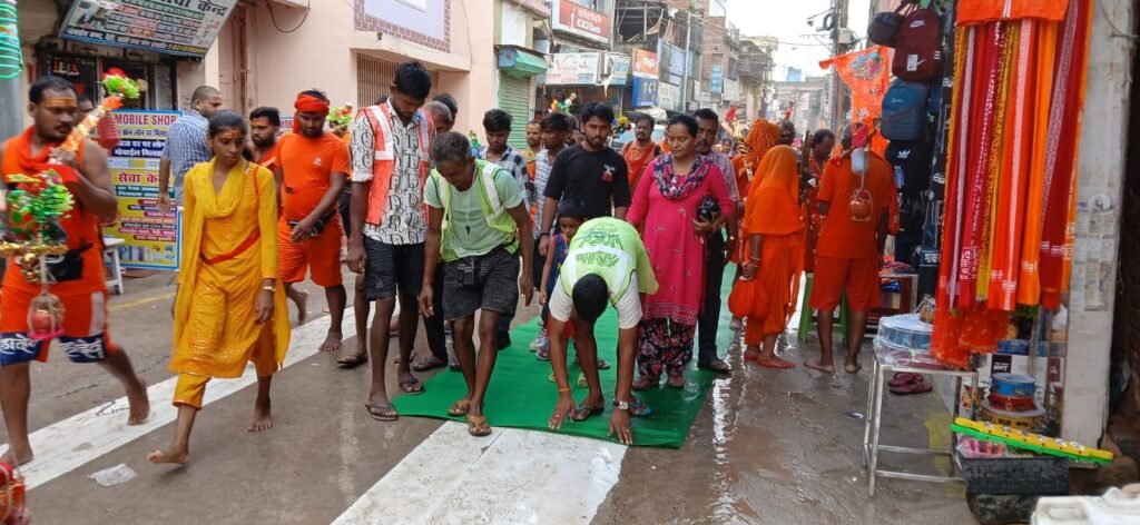 भागलपुर सुल्तानगंज के अजगैबीनाथ धाम में श्रावणी मेला के छठे दिन नेपाल के महिला कांवरिया सूनिता देवी ने अपने पुत्र एवं पुत्री के डाक्टर बनने की खूशी में सावा किलोमीटर तक कांवरियों की सुविधा को लेकर कारपेट बिछाया। इस मौके पर नेपाल के महिला कांवरिया सूनिता देवी ने बताया कि मैं सरकारी नर्स में कार्यरत हुं और अपने पुत्र एवं पुत्री के डाक्टर बनने की खूशी में कांवरिया मार्ग में सावा किलोमीटर तक कांवरियों की सुविधा के लिए कारपेट बिछा रही हुं। हमारे पुत्र डाक्टर प्रशांत यादव एवं पुत्री सुस्मिता यादव भी होकिंग जोन्स अमेरिका में डाक्टर के पद पर कार्यरत है। इस दौरान उनके साथ कई कांवरिया मौजूद थे।