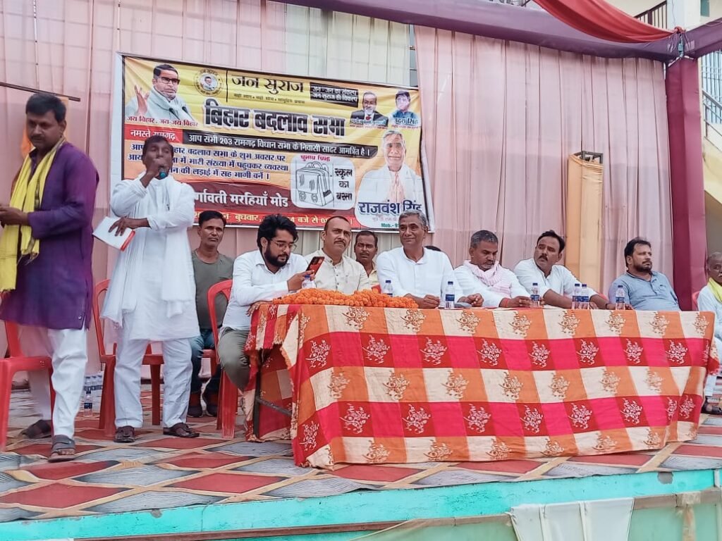 कैमूर जिले के दुर्गावती प्रखंड अंतर्गत मरहिया मोड़ पर मिलन लान में जनसुराज पार्टी के रामगढ़ विधानसभा के संभावित प्रत्याशी पूर्व डीएसपी राजवंश सिंह के नेतृत्व मे बिहार बदलाव को लेकर एक जनसभा का आयोजन किया गया, जहां पर पूर्व डीएसपी राजवंश सिंह ने बिहार सरकार पर तीखा हमला बोला।
