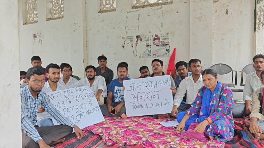 नेट/जेआरएफ दिसंबर 2023 के उत्तीर्ण अभ्यर्थियों को पैट 2023 में नामांकित करने की मांग के साथ आमरण अनशन मंगलवार को दूसरे दिन भी जारी रहा। आमरण अनशन पर आदर्श बिहारी बुद्ध प्रिय, लोकेश राज, सरफराज, सरोज कुमार बैठे है।