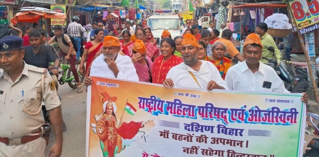 राष्ट्रीय महिला परिषद एवं ओजस्विनी भोजपुर, आरा की बैनर तले पदयात्रा निकाली गई। भारत देश के प्रधानमंत्री नरेन्द्र भाई मोदी की मां के ऊपर अभद्र भाषाओं का प्रयोग गलत है। इस दुनिया में नहीं है या है भी तो महिलाओं-बहनों पर अभद्रता की वाक्य सही नहीं है, सो बहुत हुआ। अब महिला समाज, मां-बहनों की अपमान नहीं सहेगा और न हिंदुस्तान सहेगा। ये तो एक झांकी है, शेष कार्य बाकी है। लव-जिहाद पर रोक लगाओ। नारी ही .. दुर्गा, लक्ष्मी, काली है। इन वाक्य पर ध्यान कोई नहीं करेगा, तो जन आंदोलन सारी महिला समाज करेगी।