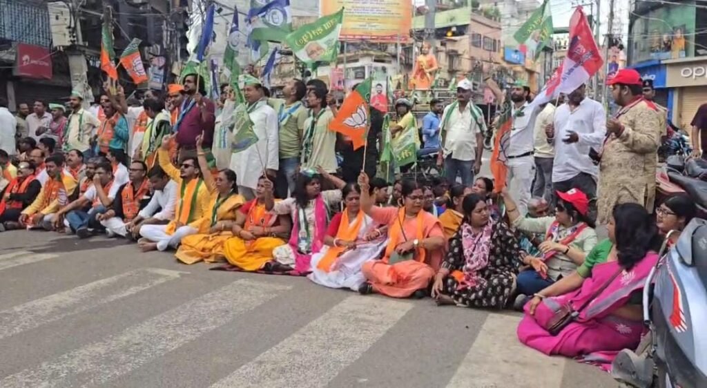 दरभंगा में देश के प्रधानमंत्री नरेंद्र मोदी की मां को लेकर की गई अभद्र टिप्पणी के विरोध में आज बिहार बंद का आह्वान किया गया है। बंद का असर भागलपुर में भी देखने को मिला। सुबह से ही एनडीए घटक दल के कार्यकर्ता सड़कों पर उतरकर दुकानों और यातायात को बंद कराने में जुटे रहे। इस दौरान राज्यसभा की पूर्व सदस्य एवं जदयू नेत्री कहकशां परवीन, भाजपा जिला अध्यक्ष संतोष साह, दीपक चौहान, कुश पांडे और रोहित पांडे सहित कई एनडीए नेता सड़क पर उतरे और विरोध जताया। कार्यकर्ताओं ने केंद्र और राज्य सरकार से दोषियों पर कड़ी कार्रवाई की मांग की है बंद का व्यापक कसर भागलपुर में देखने को मिला, जहां एनडीए घटक दल के सभी पार्टियों के कार्यकर्ता सड़क पर उतरे, इस दौरान कार्यकर्ताओं का साफ कहना था कि जिस तरह वोटर अधिकार यात्रा के दौरान और राहुल गांधी और तेजस्वी यादव के मंच से प्रधानमंत्री की मां के खिलाफ अपशब्द कहा गया वह कहीं से क्षमा योग्य नहीं है, तेजस्वी यादव और राहुल गांधी को प्रधानमंत्री और देश से माफी मांगनी होगी, ये दोनों जब तक माफी नहीं मांगेंगे तब तक चरणबद्ध आंदोलन चलता रहेगा।