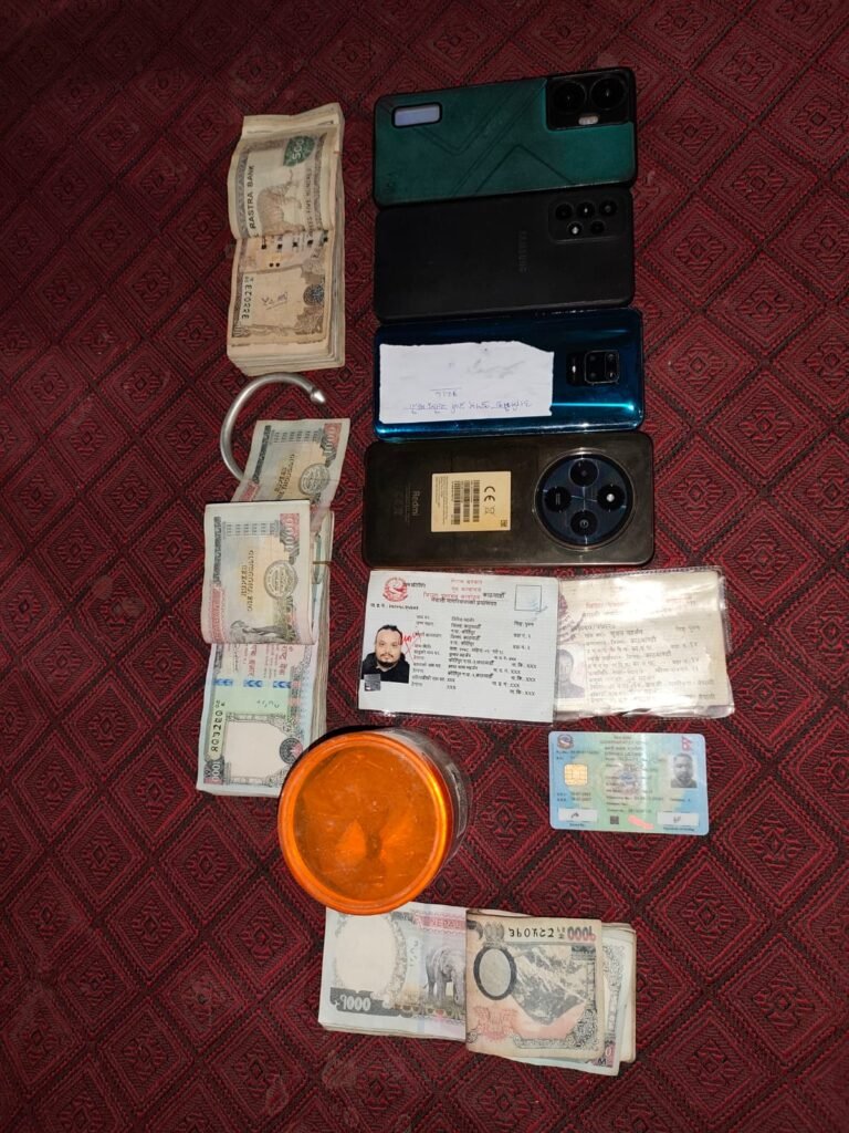- 02 लाख नेपाली रुपैया, चार मोबाईल एवं एक मोटरसाइकिल भी जब्त