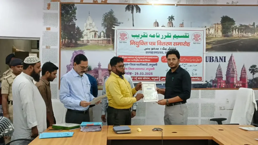मधुबनी: नव नियुक्त 19 सहायक उर्दू अनुवादकों का नियुक्ति-पत्र का वितरण जिला स्तर पर जिला पदाधिकारी अरविन्द कुमार वर्मा द्वारा समाहरणालय में आयोजित एक संक्षिप्त कार्यक्रम में किया गया। जिलाधिकारी ने कहा कि