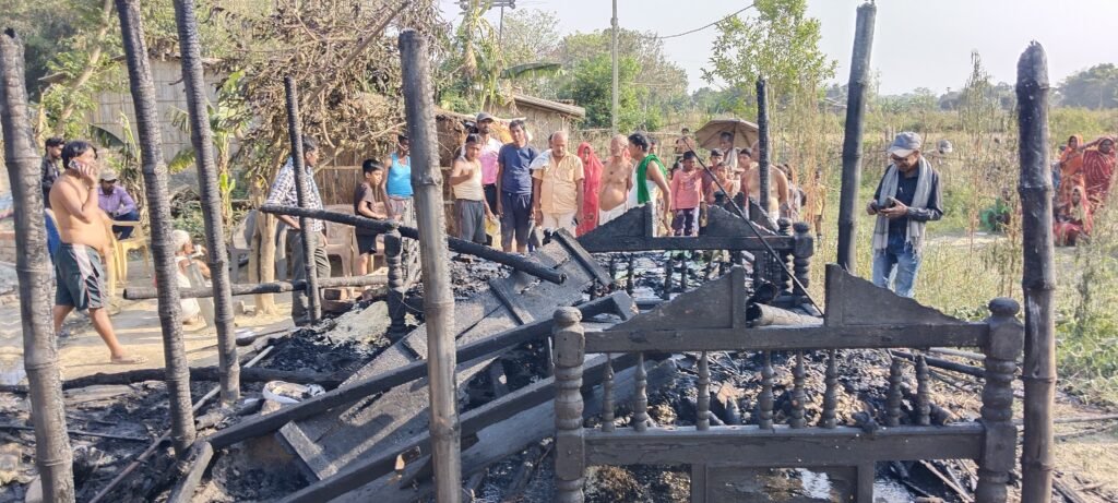 इस संबंध में गृहस्वामी प्रमोद राम ने बताया की दिन के करीब दो बजे बिजली की शर्ट सर्किट से एक बांस-बल्ले की घर में अचानक आग लग गई। देखते ही देखते घर में रखें दो लकड़ी के पलंग, अनाज, कपड़ा, 25 हजार नकद सहित करीब दो लाख रुपये मूल्य का समान जलकर राख हो गया। आसपास के लोगों के सहयोग से आग को फैलने से रोका गया। पंचायत के मुखिया अनिता देवी द्वारा पीड़ित परिवार को तत्काल भोजन के लिए राशन की व्यवस्था की गई है।