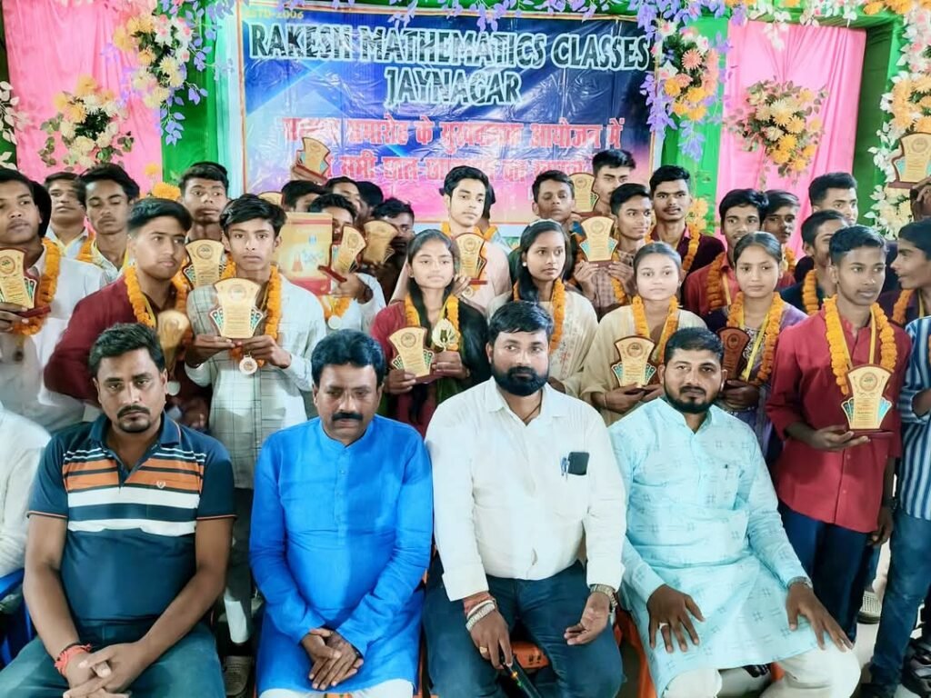 मधुबनी/जयनगर: मधुबनी जिला के जयनगर के किसान भवन परिसर में राकेश मैथमैटिक्स क्लासेज जयनगर के द्वारा मैट्रिक परीक्षा में उत्तीर्ण छात्र एवं छात्राओं का सम्मान समारोह कार्यक्रम का आयोजन किया गया। कार्यक्रम की शुरुआत मुख्य अतिथि नगर पंचायत जयनगर के मुख्य पार्षद कैलाश पासवान, शिक्षाविद डॉ० मनोज कुमार वर्मा, पूर्व विधायक प्रत्याशी सह राजद नेता ब्रज किशोर यादव, शिक्षक राम पूजन यादव, अधिवक्ता चंदेश्वर यादव, मुखिया प्रतिनिधि जामुन चौधरी, भोला यादव, बेचन सिंह, सरोज यादव, सुधीर सिंह, भूषण जी, राजेश कुमार झा, कैलाश मंडल, मुकुंद कुमार, कुलदीप सिंह, मोहम्मद अशरफ ने संयुक्त रूप से दीप प्रज्वलित कर किया।कार्यक्रम में 400 से अधिक अंक लाने वाले 41 बच्चों को मोमेंटो और मेडल देकर सम्मानित किया गया, साथ ही मैट्रिक परीक्षा में उत्तीर्ण सभी बच्चे को मेडल देकर सम्मानित किया गया। संस्थान के अधिकांश बच्चे प्रथम श्रेणी से उत्तीर्ण हुए। सर्वाधिक अंक अर्जित करने के मामले में पंकज कुमार संस्थान में पहले पायदान पर रहा। उसने 463 अंक हासिल किए। राकेश मैथमैटिक्स क्लासेज के सभी विद्यार्थियों ने अच्छा मार्क से पास हुआ है, जिसमे सत्यम कुमार 460,आदित्य राज 459,सुमित कुमार 458,मोहम्मद नजीम 455,मंयक राज 451,मंजू कुमारी 445,गुरुदेव ठाकुर 444,शिवम कुमार 443,शुभम गिरी 443,किशन कुमार 438,अभिषेक कुमार 435,सत्यम पण्डित 435,मोहम्मद फैसल 434,अजय कुमार 430 मार्क्स सहित कई छात्रों 400 से अधिक मार्क्स प्राप्त किया है।