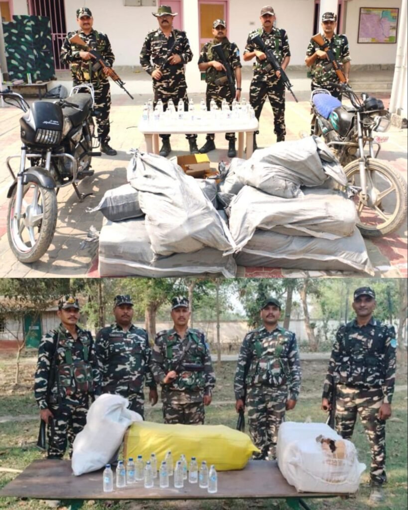 पहली कार्यवाही में, सीमा चौकी कमला के जवानों ने गश्त ड्यूटी के दौरान भारत-नेपाल सीमा स्तंभ संख्या-270/08 से लगभग 300 मीटर भारत की ओर नेपाली देसी शराब तस्करी करते हुए सौरभ सौफी की 1020 बोतलें (300 मिली) कुल 306 लीटर शराब और दो बाइक जब्त की।