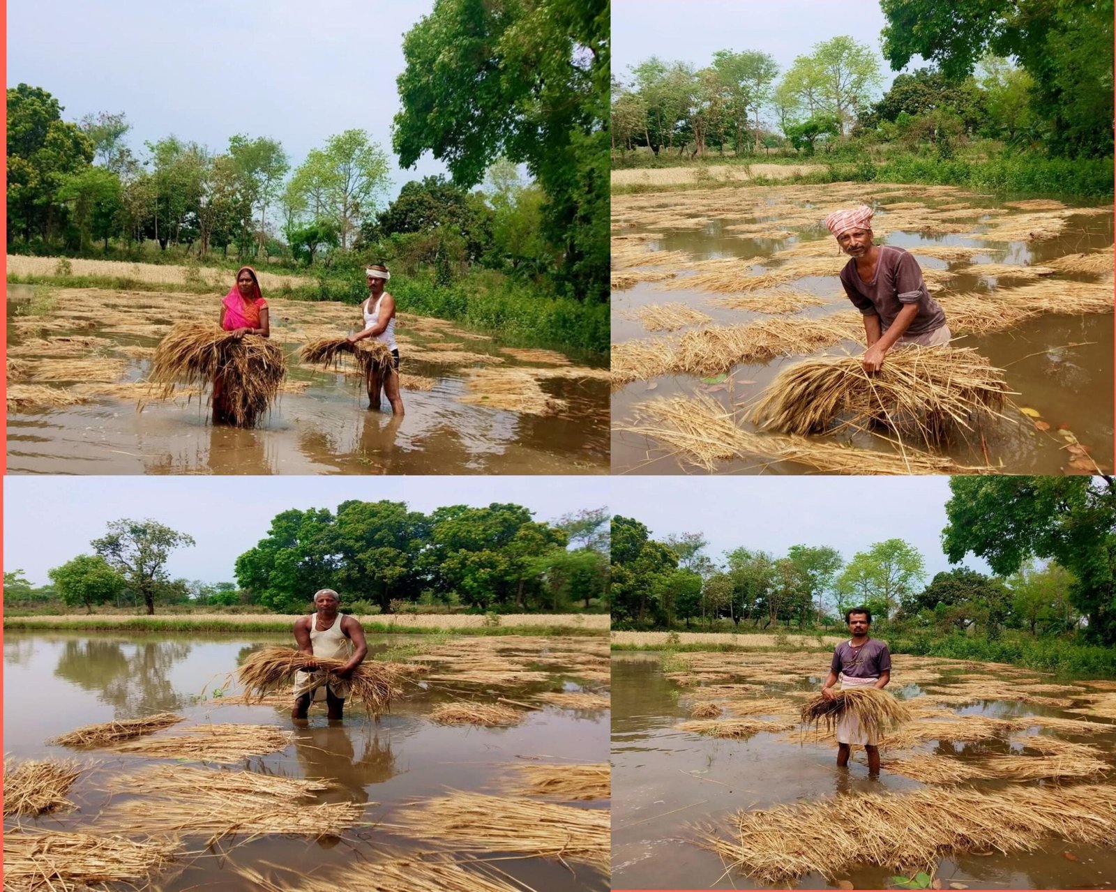 मधुबनी/खजौली: मधुबनी जिले के खजौली प्रखंड क्षेत्र में पिछले दो दिनों से रुक रुककर हो रही मूलाधार बारिश ने गेहूं की फसल को बर्बाद कर दिया है। बारिश कृषकों के लिए आफत बनकर आई है। कृषक काफी परेशान हैं। उन्हें अपने गेहूं की फसल को बचाने का कोई उपाय नहीं सूझ रहा है। आखिर वे करें भी तो क्या करें? जिन कृषकों ने अपनी गेहूं की फसल की कटनी कर थ्रेसिंग के लिए उसे खेतों में छोड़ रखा था, वह पानी में डूब चुका है। कृषक पानी में डूबे गेहूं की फसल को जैसे-तैसे पानी से निकाल रहे हैं। कृषकों का कहना है कि पानी में डूबा गेहूं का सारा फसल बर्बाद हो गया है। फिर भी पानी से इस उम्मीद से निकाल रहे हैं कि पशु के चार के रुप में कमसे कम कुछ भूंसा ही प्राप्त हो जाए। खेतों में लगी गेहूं की फसल भी तेज हवा के कारण जमीन पकड़ ली है। वह भी पानी में डूबा हुआ है। कृषकों को गेहूं की फसल में लागत का अब कुछ भी मिलने की उम्मीद नहीं बची है। कृषक प्रकृति की मार से व्यथित हैं।