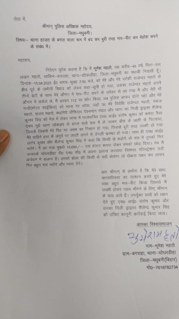 मधुबनी (बिहार)। थाना क्षेत्र घोघरडीहा के बगराहा गांव निवासी मुनेश महतो ने मधुबनी पुलिस अधीक्षक से न्याय की गुहार लगाई है। उन्होंने आरोप लगाया है कि 15 अप्रैल 2025 की शाम करीब 7 बजे जब वह अपने बेटे राजेन्द्र महतो को लाने समधी के घर गए थे, उसी दौरान संजय महतो और उनके भाई ने उनके साथ मारपीट की। उन्होंने 112 पर कॉल कर पुलिस को सूचना दी, जिसके बाद पुलिस उन्हें और उनकी बाइक को थाने ले गई।