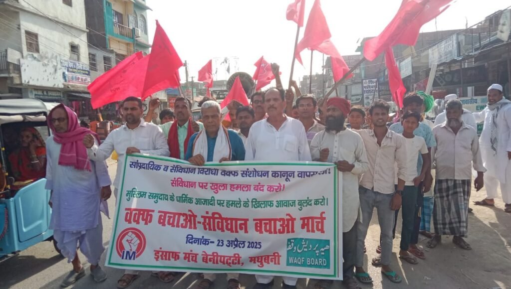 मधुबनी/बेनीपट्टी : मधुबनी जिले के बेनीपट्टी प्रखंड के अंबेडकर चौक से लोहिया चौक तक इंसाफ मंच के बैनर तले प्रतिवाद मार्च निकाला गया। यह प्रतिवाद मार्च साम्प्रदायिक व संविधान विरोधी वक्फ संशोधन कानून वापस लेने की मांग, संविधान पर भाजपा सरकार के खुल्लम-खुला हमला बंद करने तथा मुस्लिम समुदाय की धार्मिक आजादी पर हमला बंद करने की मांग पर आयोजित हुआ। इस मार्च का नेतृत्व इंसाफ मंच के प्रदेश उपाध्यक्ष नियाज़ अहमद व भाकपा-माले बेनीपट्टी प्रखंड सचिव श्याम पंडित ने किया। यह मार्च बेनीपट्टी के अंबेडकर चौक से बेहटा बाजार होते हुए इंद्रा चौक लेकर लोहिया चौक के समीप सभा मे तबदिल हो गया।