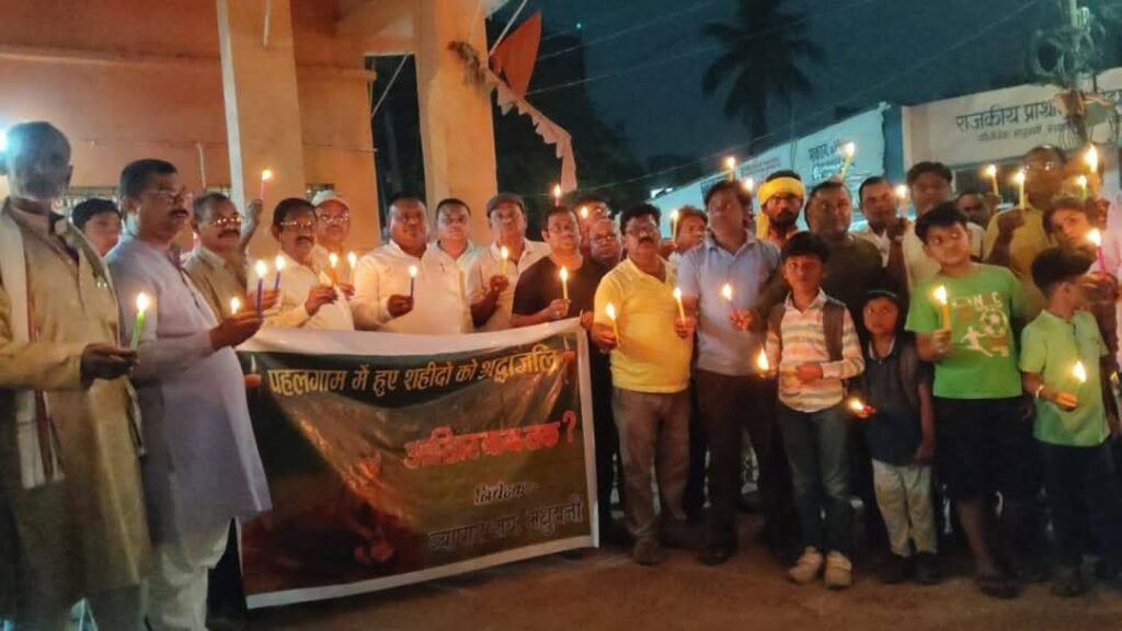 मधुबनी : मधुबनी नगर के गांधी चौक पर बीते 22अप्रैल को जम्मू-कश्मीर के पहलगाम में हुए आतंकवादी घटना में शिकार हुए मृतकों की स्मृति में व्यापार संघ,मधुबनी ने कैंडल मार्च निकाल कर मौन प्रदर्शन किया।