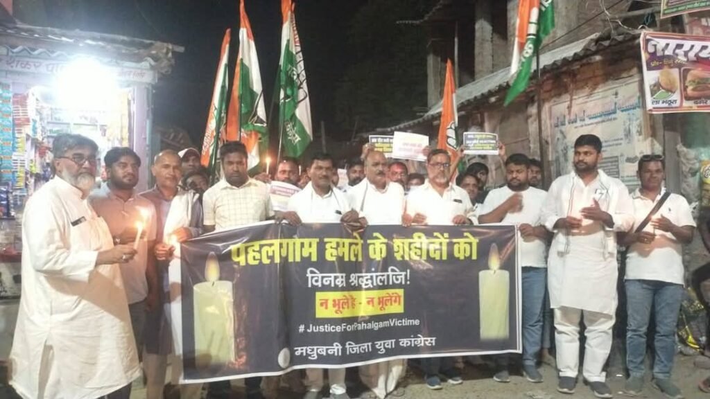 मधुबनी/बेनीपट्टी : जम्मू कश्मीर के पहलगाम में बीते 22अप्रैल को आतंकियों के द्वारा नृशंस कायराना हमले में मारे गए शहीदों को युवा कांग्रेस के द्वारा जिले के बेनीपट्टी प्रखंड के स्थानीय बाजार में कैंडल मार्च निकालकर श्रद्धांजलि दिया गया और आतंकी पर कठोर कार्रवाई की मांग की गई।