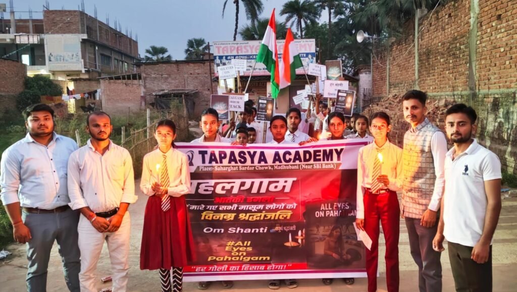 मधुबनी/मधवापुर : जम्मू-कश्मीर के पहलगाम में हुए आतंकी हमले के विरोध में देर शाम जिले के मधवापुर प्रखंड के साहरघाट में एक विशाल कैंडल मार्च निकाला गया। मार्च की शुरुआत सरदार चौक स्थित तपस्या एकेडमी से हुई, जो नेता जी चौक होते हुए राम जानकी चौक के आंबेडकर पार्क तक पहुंची। वहां पहुंचकर लोगों ने आतंकी हमले में मारे गए पर्यटकों को श्रद्धांजलि दी और दो मिनट का मौन धारण किया। इस कैंडल मार्च का नेतृत्व विद्यालय के डायरेक्टर विशाल विक्रांत ने किया, जिसमें बड़ी संख्या में छात्र छात्राएं शामिल हुई। मार्च के दौरान “पाकिस्तान मुर्दाबाद”, “तुमको मुंहतोड़ जवाब देंगे” हर गोली का हिसाब होगा, जैसे नारे गूंजते रहे। हाथों में जलती मोमबत्तियाँ, तख्तियाँ और तिरंगे थामे बच्चों ने आतंकवाद के खिलाफ एकजुटता दिखाई और पहलगाम हमले की कड़ी निंदा की। “भारत माता की जय”, “वंदे मातरम्” और “आतंकवाद मुर्दाबाद” जैसे नारों से पूरा क्षेत्र गूंज उठा।