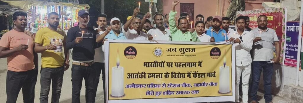 मधुबनी/जयनगर : जनसुराज पार्टी के जिला के पूर्व संयोजक विरेन्द्र यादव और पूर्व जिला मुख्य प्रवक्ता मनीष कुमार के नेतृत्व में भारतीयों पर पहलगाम में आतंकी हमला के विरोध में अम्बेडकर प्रतिमा से स्टेशन चौक-महावीर चौक होते हुए शहीद स्मारक तक कैंडल मार्च किया।
