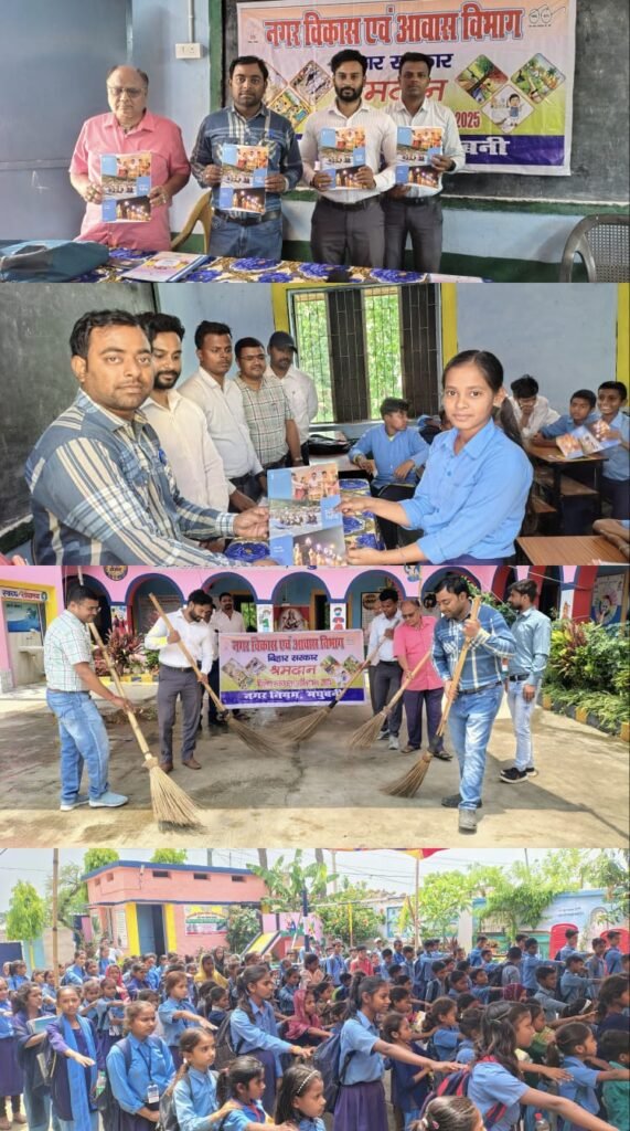 मधुबनी : नगर विकास एवं आवास विभाग के निर्देश पर नमामि गंगे अंतर्गत 15 से 30 अप्रैल तक आयोजित होने वाले विशेष स्वच्छता अभियान के तहत मंगलवार को नगर निगम मधुबनी द्वारा मध्य विद्यालय, सहुआ में स्वच्छता अभियान (श्रमदान), चित्रकारी प्रतियोगिता, स्वच्छता शपथ आदि कार्यक्रमों का आयोजन किया गया।
