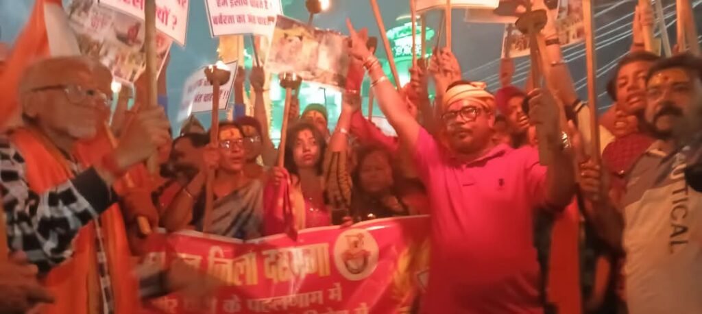 विश्व हिंदू परिषद के जिला मंत्री व इस कार्यकर्म के प्रमुख राजीव प्रकाश मधुकर की अध्यक्षता में कार्यक्रम संयोजक पंकज बारी, सह संयोजक मुन्ना ठाकुर के संयुक्त नेतृत्व में भारत सरकार के रिटायर फौजी महेंद्र शाह, विश्व हिंदू परिषद गौ रक्षा विभाग के प्रांत अध्यक्ष विजय झा, इतिहासकार रवि के पटवा, परशुराम शाह, प्रदीप गुप्ता, बजरंग दल सह संयोजक सुमित कुमार राय, विकास साहनी, विक्रम कुमार, राष्ट्रीय स्वयंसेवक संघ के नगर कारवा राजीव कुमार, नगर व्यवस्था प्रमुख विजय शंकर, मुन्ना महासेठ, महादेव जी, विजय शंकर, गोपाल कुमार के संरक्षक में शहर के शिवाजी नगर स्थित काली मंदिर के प्रांगण से मंगलवार देर शाम को कश्मीर के पहलगाम में पाकिस्तानी आतंकवादियों के द्वारा सनातनियों पर जो प्रहार कर उसकी निर्मम हत्या की, इसके विरोध में विशाल मसाल जुलूस निकाली गई। इस मसाज जुलूस में हजारों की संख्या में सनातनी सम्मिलित हुए।