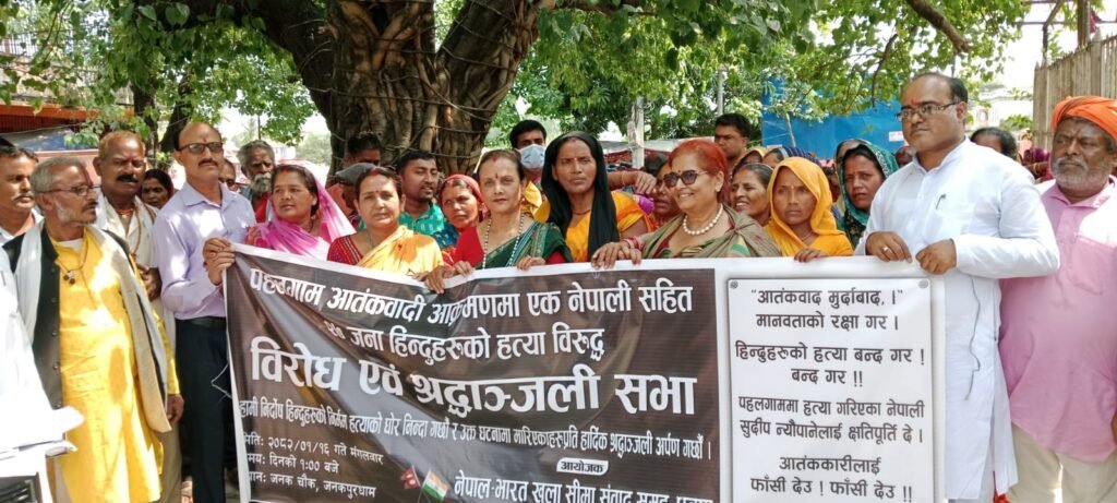 नेपाल/जनकपुरधाम : बीते 22अप्रैल को भारत के पहलगाम में हुए आतंकवादी हमले में नेपाली नागरिक सुदीप नेउपाने सहित 27 लोगों की मौत के विरोध में आज जनकचौक पर नेपाल-भारत खुली सीमा वार्ता समूह द्वारा आक्रोशपूर्ण विरोध कार्यक्रम आयोजित किया गया। हजारों नागरिकों ने विरोध प्रदर्शन में भाग लिया।