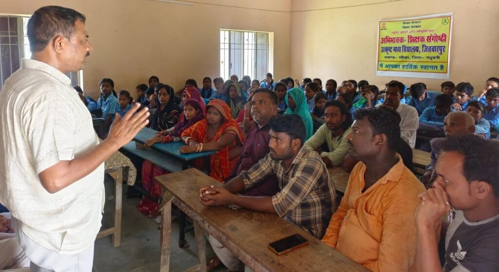 मधुबनी में उत्कृष्ट मध्य विद्यालय,जितवारपुर में प्रधानाध्यापक सतीश कुमार सिंह की अध्यक्षता में विभागीय निर्देश के अनुसार शनिवार को अभिभावक शिक्षक संगोष्ठी का आयोजन किया गया। सभी वर्ग शिक्षक अपने-अपने वर्ग में अभिभावकों का गर्मजोशी से स्वागत कर बच्चों और अभिभावकों के साथ संगोष्ठी किये। इस महीने के अंतिम दिन आयोजित इस बैठक का थीम- ‘पढेंगे, बढ़ेंगे और सीखेंगे हम’ था।