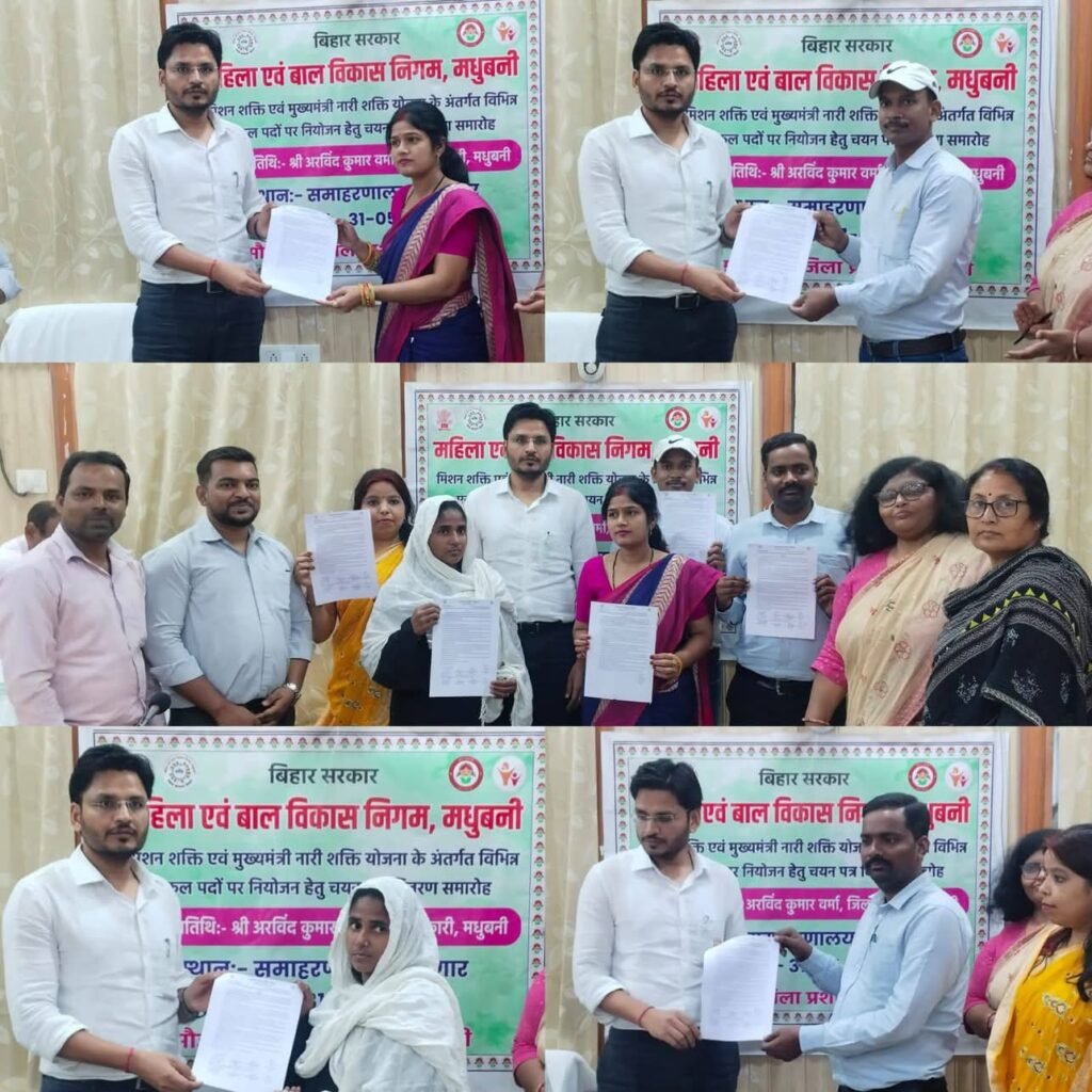 मधुबनी समाहरणालय सभागार में महिला एवं बाल विकास निगम, मधुबनी द्वारा “मिशन शक्ति” एवं “मुख्यमंत्री नारी शक्ति योजना” के अंतर्गत DHEW, OSC, एवं पालनाघर से संबंधित आठ पदों पर नियोजन हेतु चयनित अभ्यर्थियों को नियुक्ति पत्र प्रदान किए गए। इस गरिमामयी समारोह की अध्यक्षता जिलाधिकारी अरविंद कुमार वर्मा ने की। इस अवसर पर जिलाधिकारी ने चयनित अभ्यर्थियों को बधाई देते हुए कहा कि यह योजना महिलाओं को आत्मनिर्भर और सशक्त बनाने की दिशा में एक महत्त्वपूर्ण पहल है। उन्होंने राज्य एवं केंद्र सरकार दोनों की इस संयुक्त पहल की सराहना करते हुए कहा कि “मिशन शक्ति” एवं मुख्यमंत्री नारी शक्ति जैसी योजनाएं सामाजिक बदलाव की दिशा में प्रभावशाली साबित हो रही हैं। उन्होंने यह भी कहा कि चयनित कर्मियों की भूमिका महत्त्वपूर्ण होगी और उनसे अपेक्षा की जाती है कि वे पूरी निष्ठा और जिम्मेदारी के साथ कार्य करें, ताकि योजनाओं का लाभ समाज के अंतिम पायदान तक पहुँच सके।समारोह में जिला परियोजना प्रबंधक, जिला कार्यक्रम पदाधिकारी एवं सम्पूर्ण महिला एवं बाल विकास निगम टीम की उपस्थिति उ रही। सभी अधिकारियों ने चयनित कर्मियों को शुभकामनाएँ देते हुए उनके उज्ज्वल भविष्य की कामना की।