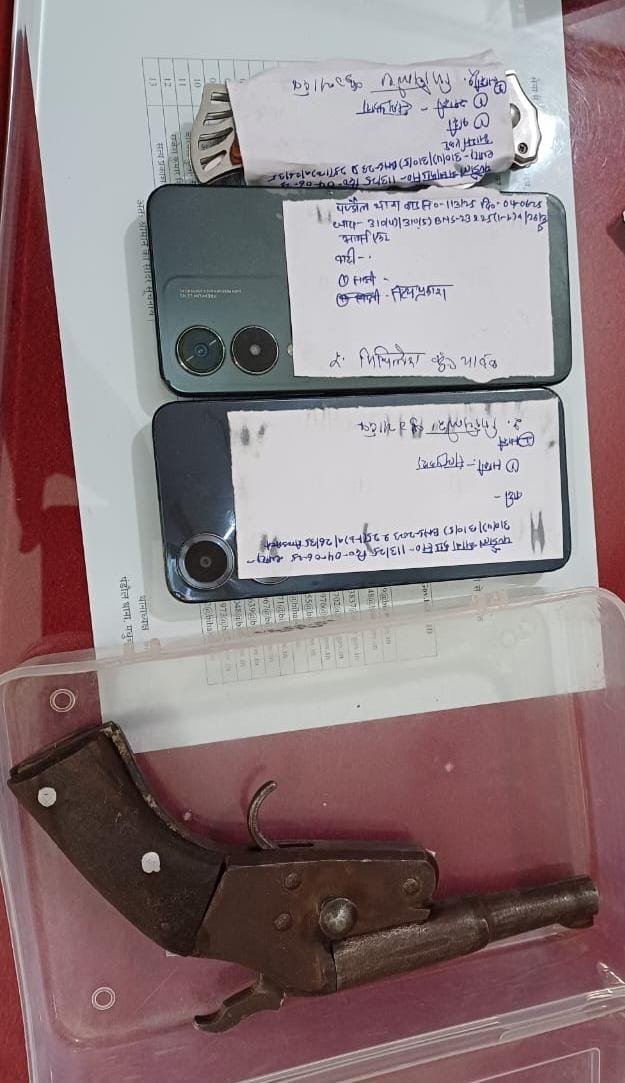 गिरफ्तार राजू चौपाल कमर के चाहिने तरफ छुपाकर रखा हुआ एक देशी कट्टा व एक स्मार्ट मोबाइल बरामद किया गया है। वहीं अपराधी अमित कुमार राय से तलाशी में एक स्मार्ट मोबाइल बरामद हुआ है। वहीं रंजन कुमार मंडल के पास से एक फॉल्डिंग चाकू बरामद किया गया है। घटना स्थल से बरामद तीन मोटर साइकिल बरामद किया गया है।