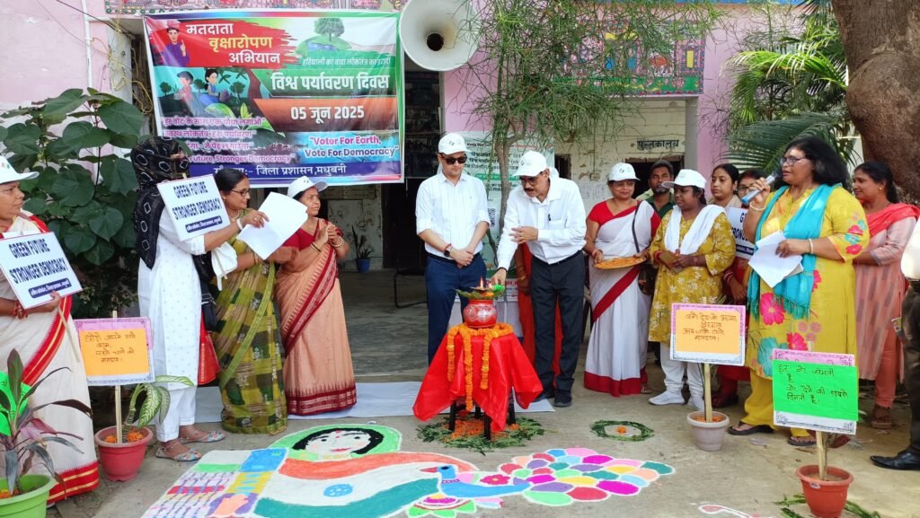 मधुबनी जिला निर्वाचन पदाधिकारी सह जिलाधिकारी आनंद शर्मा ने पर्यावरण दिवस के अवसर पर शिवगंगा बालिका विद्यालय,मधुबनी स्थित मतदान केंद्र पर आयोजित मतदाता जागरूकता कार्यक्रम का दीप प्रज्वलित कर उद्घाटन किया।गौरतलब हो कि जिले में 3 से 5 जून 2025 तक चल रहे तीन दिवसीय विशेष स्वीप कार्यक्रमों के अंतर्गत, आज पर्यावरण दिवस के अवसर पर जिले मतदान केंद्रों पर मतदाता जागरूकता और पर्यावरण संरक्षण को एक साथ जोड़ते हुए कई गतिविधियां आयोजित की गई। आईसीडीएस,जीविका एवं शिक्षा विभाग के द्वारा जिले में पौधरोपण अभियान के साथ साथ मतदाता जागरूकता शपथ भी दिलाई गई।