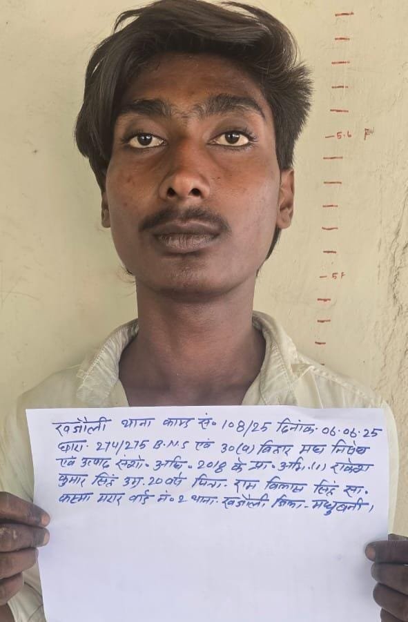 मधुबनी जिले के खजौली थाना क्षेत्र के सुक्की सायफन पुल के पास से संध्या गश्ती के क्रम में एसआई निधि कुमारी के नेतृत्व में स्थानीय थाना पुलिस ने 90 लीटर नेपाली देशी शराब के साथ एक धंधेबाज को गिरफ्तार किया। इस क्रम में पुलिस ने धंधेबाज की काले रंग की एक बाइक भी जब्त की। गिरफ्तार धंधेबाज की पहचान स्थानीय थाना क्षेत्र के कसमा मरार वार्ड दो निवासी रामविलास सिंह के पुत्र राकेश कुमार सिंह के रुप में हुई है। पूछताछ बाद धंधेबाज को जेल भेज दिया गया। धंधेबाज अपनी बाइक से शराब लेकर भकुआ से खजौली की ओर आ रहा था, जहां रास्ते में सुक्की सायफन पल के पास उन्हें गिरफ्तार किया गया।
