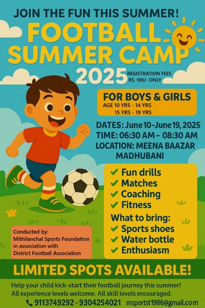 डिस्ट्रिक्ट फुटबॉल एसोसिएशन मधुबनी के सचिव सुनील कुमार मीडिया से बात करते हुए जानकारी दी गई कि एसोसिएशन द्वारा फुटबॉल के स्तर को नीचे से निखारने एवं तरासने के लिए “फुटबॉल समर कैंप” का आयोजन किया जा रहा है। मधुबनी शहर के आर० के० कॉलेज ग्राउंड में प्रथम बार 15 दिवसीय फुटबॉल कोचिंग का आयोजन किया जा रहा है। “फुटबॉल समर कैंप” में 10 वर्ष से ऊपर के सभी वर्गों और सीनियर बच्चों को मंगलवार प्रातः 6: 30 से 8:30 एवं संध्या 4 से 6 बजे तक मान्यता प्राप्त कोच द्वारा फुटबॉल के विभिन्न कौशल का प्रशिक्षण दिया जाएगा। मीडिया के माध्यम से हम इस आयु वर्ग के सभी बच्चों और उनके अभिवावकों से अपील करना चाहते हैं कि वे जिले में आयोजित हो रहे पहले फुटबॉल समर कैंप में अधिक संख्या में भाग लें और समर कैंप के आयोजन को सफल बनाए। जिससे कि हम भविष्य में इस तरह एक और भी बेहतर आयोजन कर सकें।