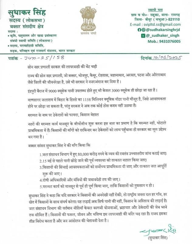 बक्सर सांसद सुधाकर सिंह ने बिहार सरकार के जल संसाधन विभाग की कार्यप्रणाली पर तीखा हमला बोलते हुए कहा है कि विगत 20 वर्षों में सिंचाई और बाढ़ नियंत्रण के नाम पर 80,000 करोड़ रुपये खर्च किए गए, लेकिन इन भारी भरकम निवेशों के बावजूद सिंचाई क्षमता में 25% की गिरावट आई है और बाढ़ प्रभावित क्षेत्र घटने के बजाय बढ़ा है। सुधाकर सिंह ने कहा कि 2005 में जब राबड़ी देवी जी का कार्यकाल समाप्त हुआ था, तब राज्य में 12.5 लाख हेक्टेयर भूमि में सिंचाई की सुविधा थी। आज, दो दशक बाद यह घटकर 9.5 लाख हेक्टेयर रह गई है। यह आंकड़े स्पष्ट रूप से दर्शाते हैं कि किसानों के नाम पर बजट पारित कर, योजनाओं को कागजों में चलाकर सिर्फ ठेकेदारों, अधिकारियों और सत्ताधारी नेताओं की जेबें भरी गईं, न कि किसानों को लाभ मिला। आगे श्री सिंह ने यह भी कहा कि हर साल 4000 करोड़ रुपये से अधिक सिंचाई और बाढ़ नियंत्रण में खर्च किए जाते हैं, लेकिन एक इंच भी बाढ़ग्रस्त भूमि बाढ़-मुक्त नहीं हुई है। उल्टे, आंकड़े बताते हैं कि बाढ़ की चपेट में आने वाला क्षेत्र और बढ़ा है।