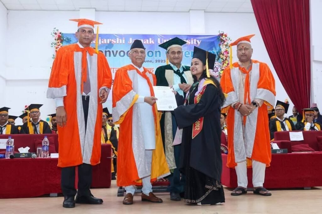 जनकपुरधाम त्रेता युग से ही ज्ञान, दर्शन तथा विद्वता का केंद्र है। उपयुक्त बातें प्रधानमंत्री तथा कुलपति पीएम ओली ने जनकपुरधाम के महेंद्र नारायण निधि सांस्कृतिक केंद्र के सभागार में आयोजित राजर्षि जनक विश्वविद्यालय के प्रथम दीक्षांत समारोह में कही। उन्होंने कहा कि चार हजार वर्ष पश्चात राजर्षि जनक विश्वविद्यालय की स्थापना हुई है। यह गर्व की बात है। उन्होंने कहा कि शासकीय कुव्यवस्था तथा राजनीति स्वार्थ के चलते विश्वविद्यालय स्थापना में देर हुयी। उन्होंने कहा कि पाश्चात्य देशों से पहले नेपाल में विश्वविद्यालय थी। यहां के विश्वविद्यालय में सभी बिषयो की पढ़ाई होती थी। हमने जनकपुरधाम के अष्टावक्र, याज्ञवल्क्य, पाणिनि जैसे अनेक विद्वान तथा बिदूषी को भूला दिए। उन्होंने प्रसन्नता व्यक्त किया कि राजर्षि जनक विश्वविद्यालय के छात्र प्रथम वार दीक्षांत समारोह में