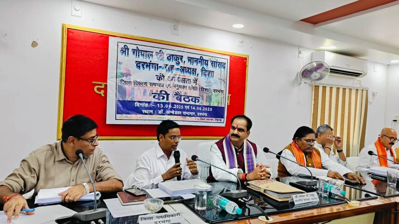 दरभंगा समाहरणालय के बाबा साहेब डॉ. भीमराव अम्बेदकर सभागार में दरभंगा के सांसद सह अध्यक्ष दिशा डॉ. गोपालजी ठाकुर की अध्यक्षता में जिला विकास समन्वय व अनुश्रवण समिति (दिशा) की बैठक हुई। बैठक के प्रारंभ में गत बैठक की कार्यवाही के अनुपालन की समीक्षा उप विकास आयुक्त स्वप्निल के द्वारा अवगत कराया गया। अध्यक्ष ने समीक्षा के क्रम में विकास योजनाओं में गुणवत्ता और पारदर्शिता की महत्ता पर जोर देते हुए कहा कि बैठक का मूल उद्देश्य है कि केंद्र और राज्य सरकार की योजनाओं को शत-प्रतिशत धरातल पर साकार करना है।