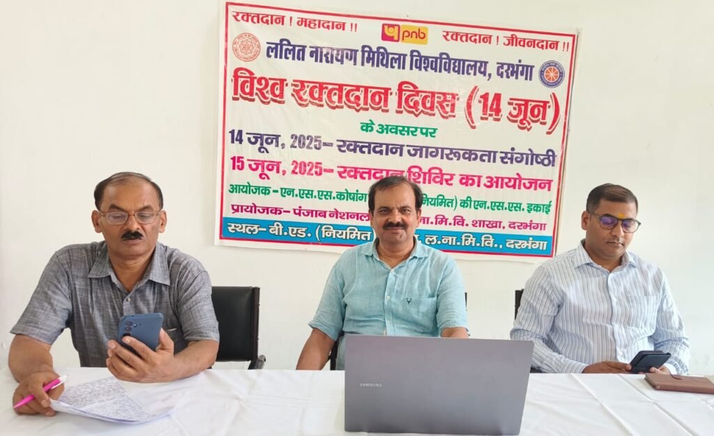 विश्व रक्तदाता दिवस के अवसर पर ललित नारायण मिथिला विश्वविद्यालय, दरभंगा के एनएसएस कोषांग एवं बीएड विभाग की एनएसएस इकाई के संयुक्त तत्वावधान में आज “रक्तदान जागरूकता” विषय पर वेबीनार का आयोजन बीएड विभागाध्यक्ष डॉ अरविन्द कुमार मिलन की अध्यक्षता में आयोजित किया गया, जिसमें विश्वविद्यालय परिसर स्थित पंजाब नेशनल बैंक शाखा के मैनेजर हेमंत झा मुख्य अतिथि, कार्यक्रम संयोजक डॉ आर.एन. चौरसिया विषय प्रवेशक एवं स्वागत कर्ता तथा कार्यक्रम पदाधिकारी डॉ सोनू राम शंकर, डॉ रीता कुमारी, डॉ अरुण कुमार, डॉ विभा कुमारी, डॉ सोनी शर्मा, डॉ सरोज राय, डॉ प्रेम कुमारी एवं डॉ कुमार नरेन्द्र नीरज आदि ने अपने विचार रखें।