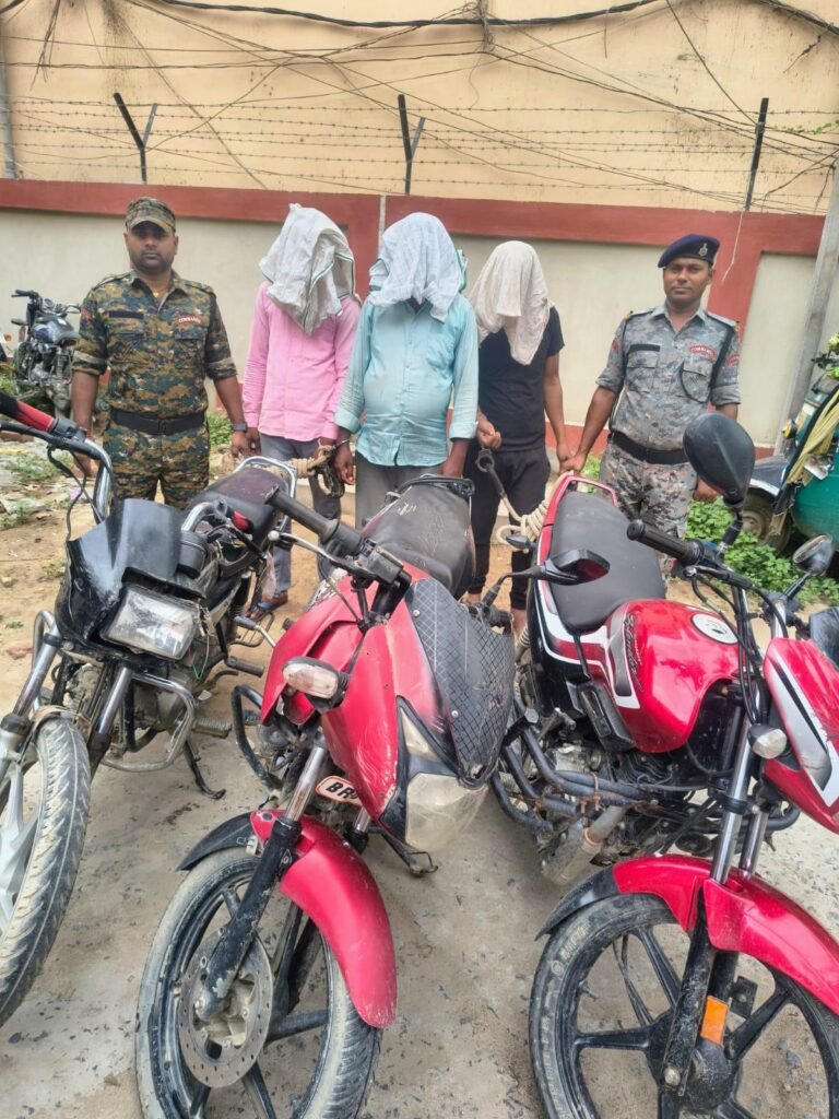 जिले के नगर थाना क्षेत्र में बीती रात सीतामढ़ी पुलिस ने मोटरसाइकिल चोरी में लिप्त एक सक्रिय गिरोह का पर्दाफाश करते हुए तीन आरोपियों को गिरफ्तार किया है। पुलिस ने इनके पास से चोरी की तीन मोटरसाइकिलें भी बरामद की हैं। यह कार्रवाई देर रात लगभग 1:30 बजे गश्ती दल द्वारा की गई। पुलिस अधीक्षक कार्यालय से जारी प्रेस विज्ञप्ति के अनुसार, नगर थाना क्षेत्र में वाहन चोरी की घटना की सूचना पर गश्ती दल सक्रिय हुआ और एक संदिग्ध व्यक्ति को हिरासत में लिया।
