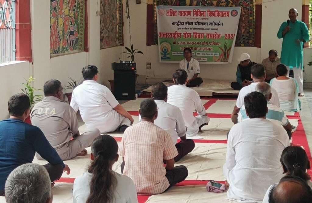 ललित नारायण मिथिला विश्वविद्यालय, दरभंगा के कुलपति प्रो संजय कुमार चौधरी के आदेश से राष्ट्रीय सेवा योजना कोषांग के द्वारा “अंतरराष्ट्रीय योग दिवस” के अवसर पर विश्वविद्यालय प्रशासनिक भवन में योगाभ्यास एवं संगोष्ठी का आयोजन किया गया, जिसमें वाणिज्य संकायाध्यक्ष प्रो एचके सिंह, कुलसचिव डॉ दिव्या रानी हंसदा, डीएसडब्ल्यू प्रो अशोक कुमार मेहता, एम.के. कॉलेज के प्रधानाचार्य डॉ मो रहमतुल्लाह, विश्वविद्यालय राजनीति विज्ञान विभागाध्यक्ष प्रो मुनेश्वर यादव, परीक्षा नियंत्रक प्रो विनोद कुमार ओझा, उप परीक्षा नियंत्रक डॉ इंसान अली, सीसीडीसी डॉ गजेन्द्र प्रसाद, भू संपदा पदाधिकारी डॉ कामेश्वर पासवान, खेल पदाधिकारी डॉ अमृत कुमार झा, कार्यक्रम संयोजक डॉ आर.एन. चौरसिया, एनएसएस पदाधिकारियों में डॉ सोनू राम शंकर, डॉ अविनाश कुमार, डॉ रीता कुमारी, प्रो शिव कुमार राय, योग प्रशिक्षक बीरेन्द्र कुमार सिंह, सह प्रशिक्षिका सिद्धि झा, अमित कुमार झा, अक्षय कुमार झा, प्रशांत कुमार झा, मनजीत कुमार चौधरी सहित 100 से अधिक व्यक्तियों ने भाग लिया।
